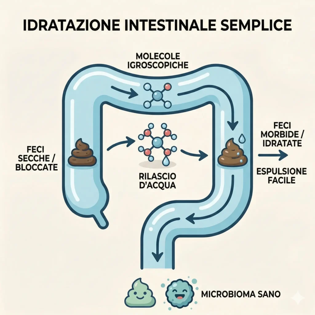 E qui succede la magia: Queste molecole catturano l’acqua come calamite. Arrivano alle feci dure e gli urlano: “IDRATATEVI! AMMORBIDITEVI!”